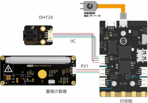 序号 名称 型号 数量 价格(元) 1 行空板 UNIHIKER 1 399 2 盖革计数器 DFROBOT 1 389 3 温湿度传感器 DFROBOT 1 50 4 20cm硅胶线 两头PH2.0-3p白色 2 2 5 合计 840 3.2 硬件连接图