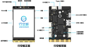 接口: USB Type-C *1 USB TYPE-A *1 microSD卡接口 *1 3Pin I/O *4 (其中支持3路PWM 2路ADC) 4Pin I2C *2 金手指: 19路无冲突I/O(支持I2C、UART、SPI、ADC、PWM)